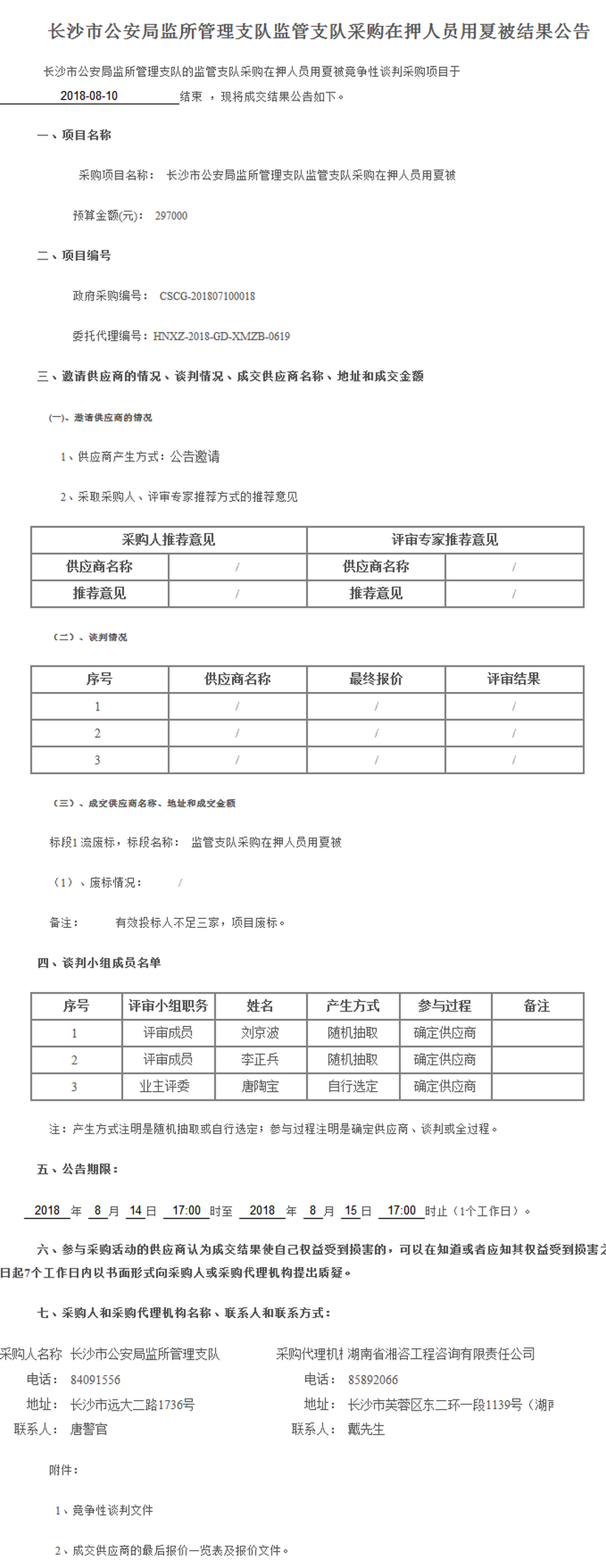 长沙市公安局监所管理支队监管支队采购在押人员用夏被结果公告