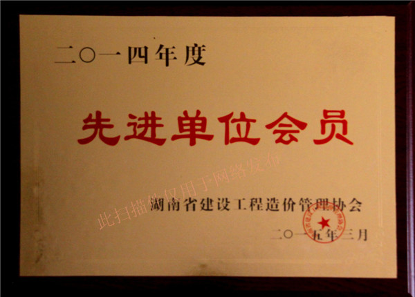 热烈庆祝我司荣获湖南省造价工程管理协会2014年度先进单位会员